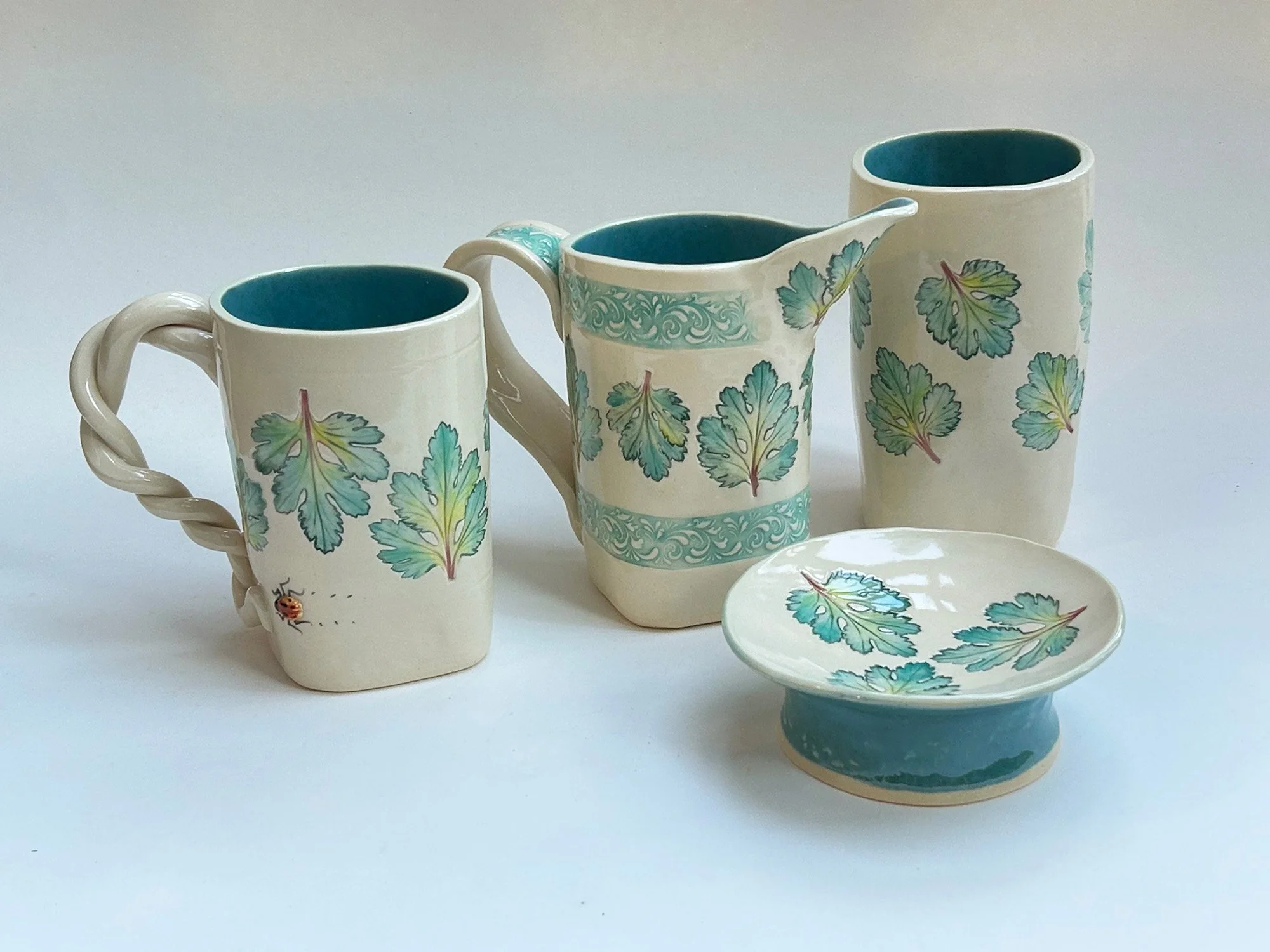 Amy Thurber has a BFA from Rhode Island School of Design. While studying illustration she dabbled in ceramics and graphic design. She spent the first 25 years illustrating and designing promotional materials for local farmers, and small businesses through her freelance business Cricket Works. Wishing to return to creative art, she began studying ceramics with Carol Nadeau. After apprenticing with Carol for 7 years, she began her own business, Doves Foot Pottery. Since then, she has been producing one of a kind functional pottery using leaves she grows in her extensive gardens. Amy is inspired by the natural world, and incorporates, colorful beetles, snails and other critters into her designs. In 2019 she returned to 2-D design with the publication of her husband, Frederick Thurber’s book, In the Wake of the Willows, which she illustrated and designed. In 2022 she completed her first book, What DO You Eat?, a cookbook about sourcing and cooking pure, local foods for people with multiple allergies. The photos in the cookbook feature her pottery and gardens.