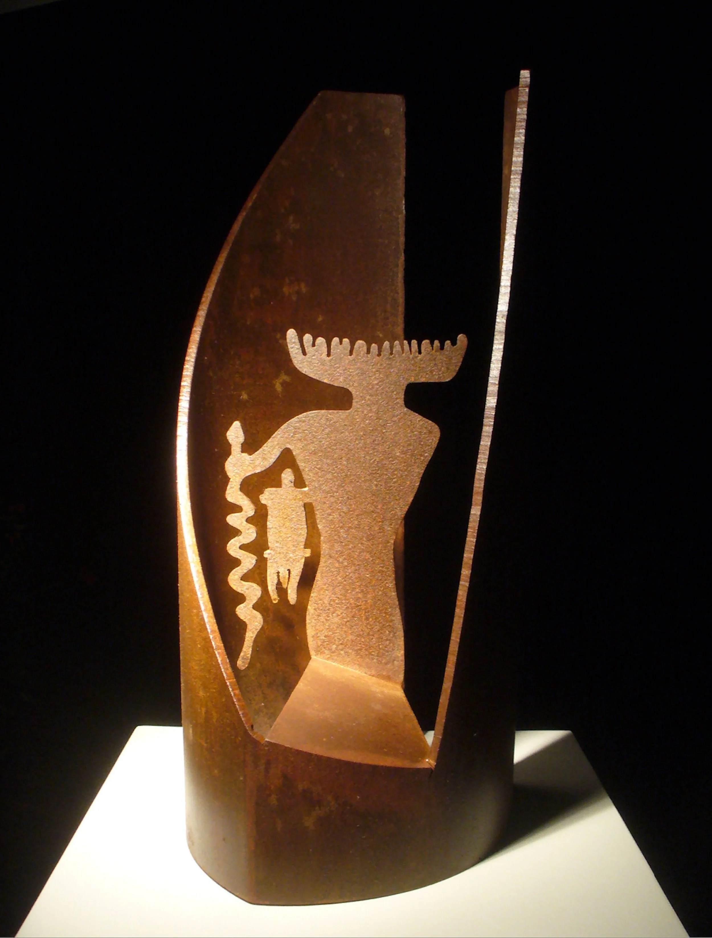 Prehistoric rock art, petroglyphs and pictographs, has had a profound influence on Mr. Lintala’s work. Sheltered in caves or under vast cliffs, these images of human kind, animals and nature were inscribed, pecked and painted onto stone. The early inhabitants who made them, their knowledge, lost to the ages.The sculptures he creates have become a narrative involving the interaction of human, cultural and natural events from the past and present. The shapes and marks that he makes, the symbols created are echoes from the prehistoric past, they tell of his observations, experiences and events that have affected him. The challenge before him is to carry on, to re-investigate, to renew this tradition of communication utilizing contemporary materials and methods and through his visual interpretations he hopes there spirits can live on.